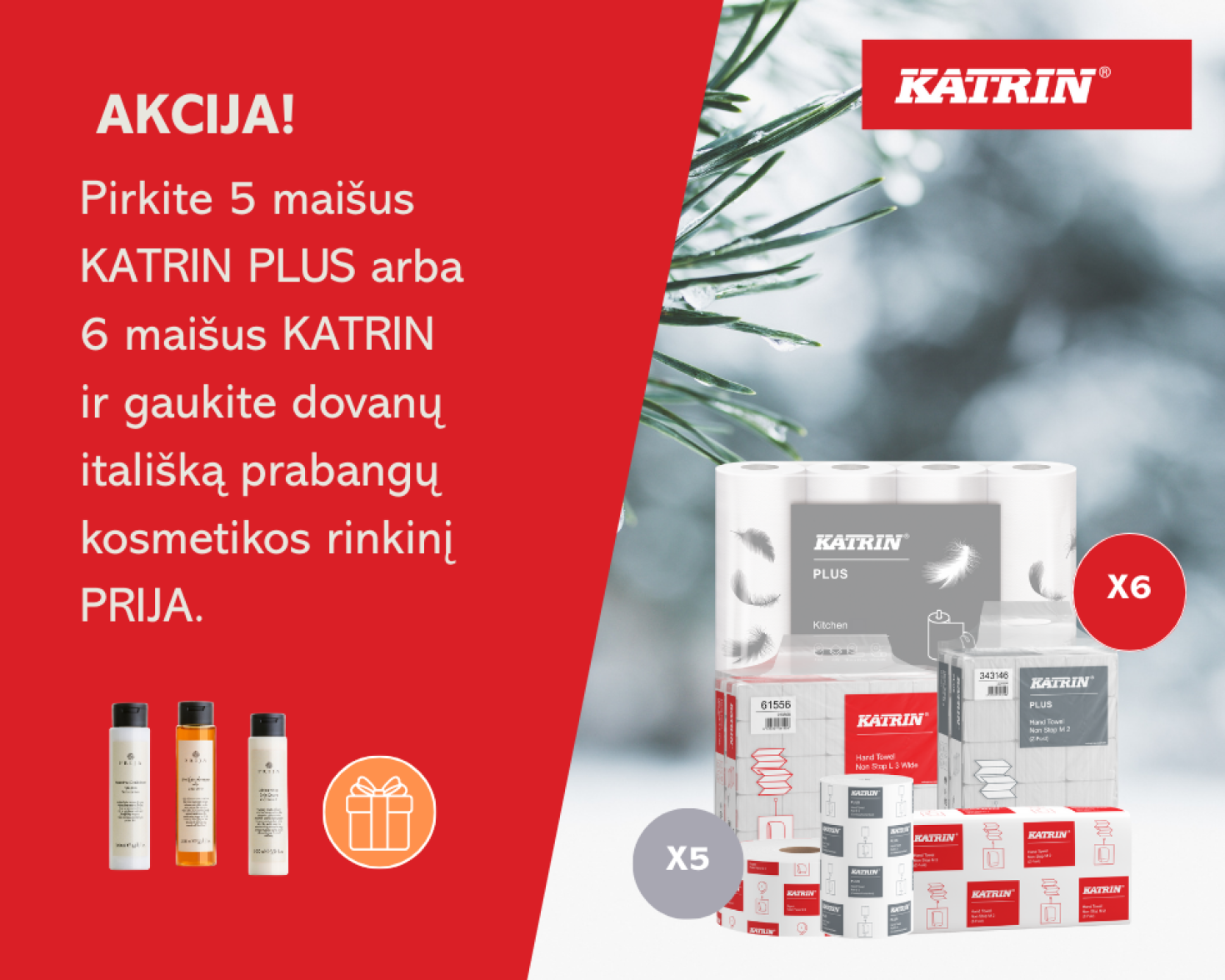 Pirkite 5 pakuotes Katrin Plus arba 6 pakuotes Katrin linijos produktų ir gaukite dovanų prabangų kosmetikos rinkinį PRIJA.