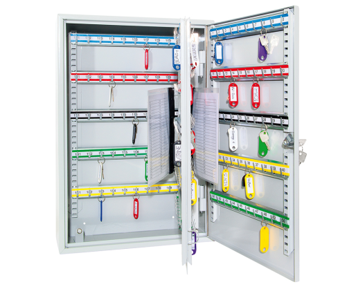 Pagaminta iš aukštos kokybės metalo. Su spynele. Talpa - 200 raktų. Matmenys: 380 x 140 x 550 mm. Galima pakabinti ant sienos. Šviesiai pilkos spalvos.