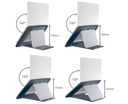 • Tinka nešiojamiesiems kompiuteriams nuo 13 iki 17 colių, o „MacBook“, kurie atsidaro ne didesniu kaip 135 laipsnių kampu, gali būti naudojami su 162 mm ir 176 mm aukščio nustatymu.