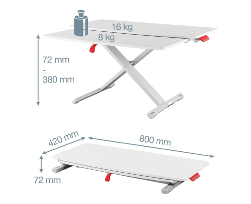 Reguliuojamas stalviršis su ištraukiamu stalčiumi klaviatūrai ir pelei leidžia lanksčiai judėti tarp sėdėjimo ir stovėjimo darbo metu, skatinant raumenų judėjimą, gerinant laikyseną ir didinant energijos lygį. Greitai ir lengvai nustatomas šis stalinis stovas akimirksniu pakeis jūsų darbo vietą ir išliks tvirtas bei stabilus bet kokiame aukštyje. Pneumatinis reguliavimas be pastangų pakels stovą į reikiamą aukštį.
