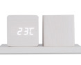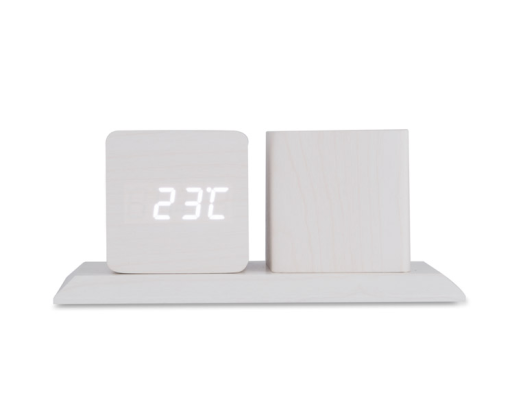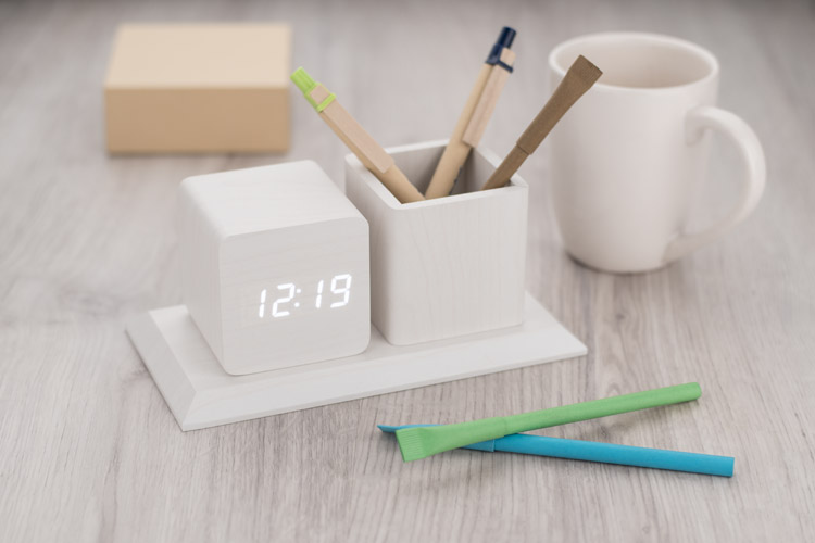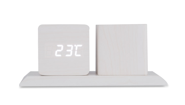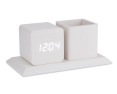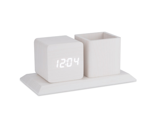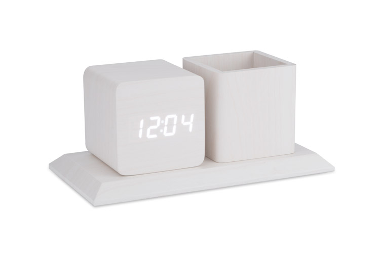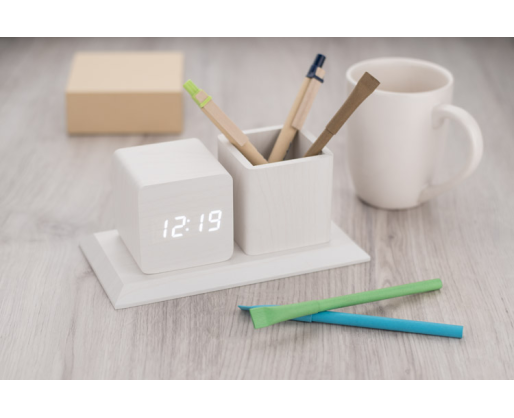Stalo laikrodis su pieštukine LITO, pagamintas iš MDF plokštės. Šviesios spalvos medienos ir modernaus dizaino, derančio prie šiuolaikinio interjero. Laikrodis turi šias funkcijas: kalendorius, žadintuvas ir termometras. Baterijos (3x AAA) nepridedamos. Išmatavimai: 188x79x98 mm. Supakuota į rudo kartono dėžutę. Baltos spalvos. Yra galimybė dėti logotipą.