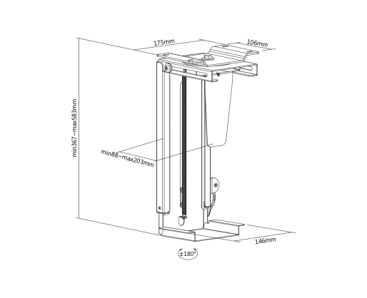 | Kitos savybės | Installation: Under the desktop. Width adjustment: 8.8 - 20.3 cm. Width adjustment: 8.8 - 20.3 cm. Compatible with many common PC housings |