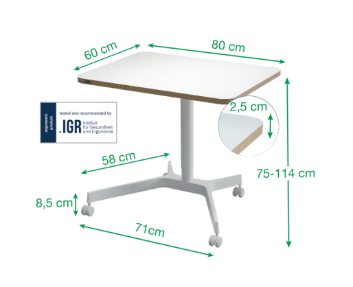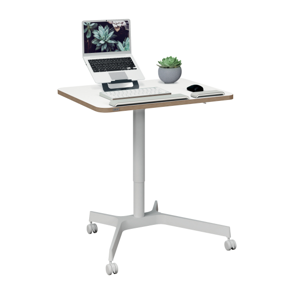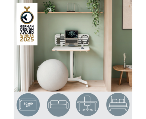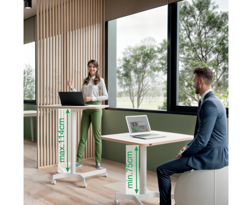 • Kompaktiškas ir stilingas mobilus sėdėjimo-stovėjimo stalas, skirtas vietoms, kuriose trūksta erdvės.