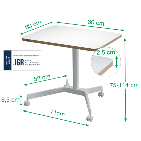 • Pneumatinė aukščio reguliavimo sistema nuo 75 iki 114 cm leidžia lengvai pritaikyti stalą įvairiems dydžiams ir poreikiams.