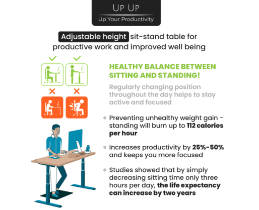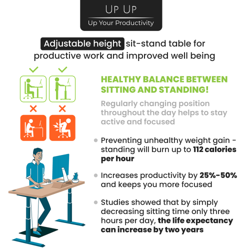Ergonomiški stalai “Up Up” - tai puikus pasirinkimas Jūsų darbo vietai. Reguliuojamo aukščio dėka, galite pritaikyti stalo aukštį pagal save bei nuolat keisti poziciją ir dirbti tiek sėdint, tiek stovint.