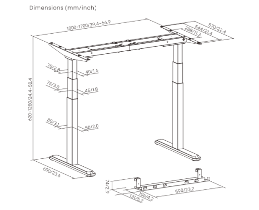(1000 ~ 1700) x 700 x (620 ~ 1280) mm |