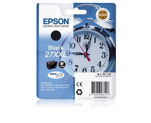 Rašalinė kasetė Epson T2711XXL (C13T27914012) Tinka spausdintuvams: Epson WorkForce Pro WF 3620DWF/ WF 3640DTWF/ WF 7110DTW/ WF 7610DWF/ WF 7620DTWF Spalva: Juoda Resursas: 2200Prekės parametrai