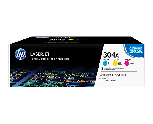 - HP 304A cartridge, 3-pack CC531A+CC532A+CC533A