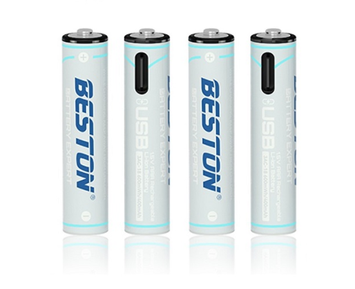 Įkraunamos AAA baterijos, 1.5V, 400mAh talpos, su USB Type-C lizdu ir pridedamu laidu USB Type-A į 2xUSB Type-C. Bateriją galima krauti naudojant 5V tinklo adapterį. Turi LED krovimo indikatorių.