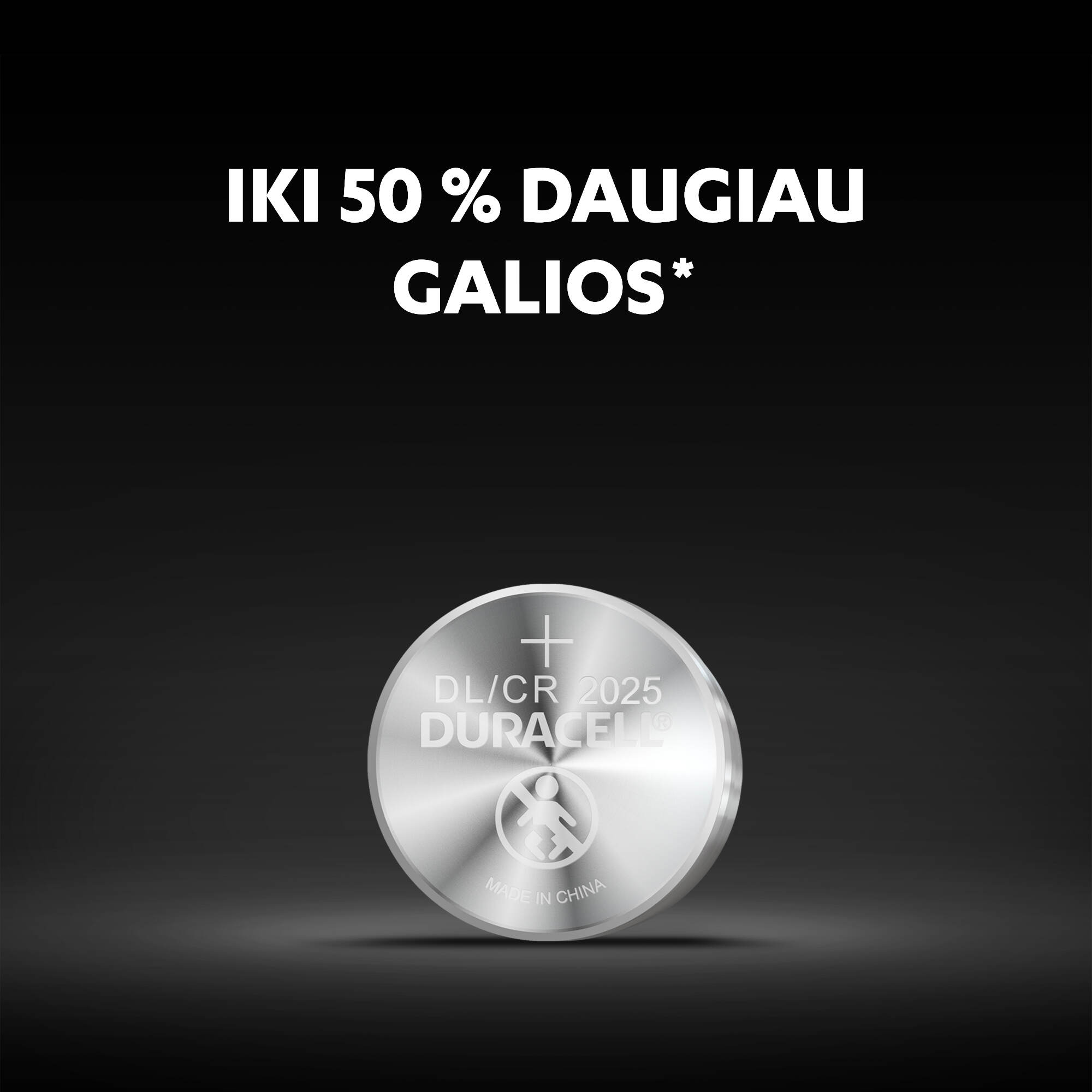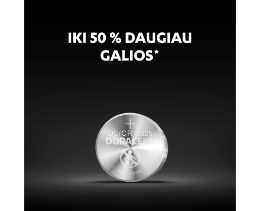 • „Duracell 2025“ ličio monetos tipo baterijos – iki 50 % daugiau galios (palyginus su IEC testuojamomis vidutinės trukmės CR2025 ličio monetos formos baterijomis kiekvieno įrenginio ir naudojimo būdo rezultatai gali skirtis).