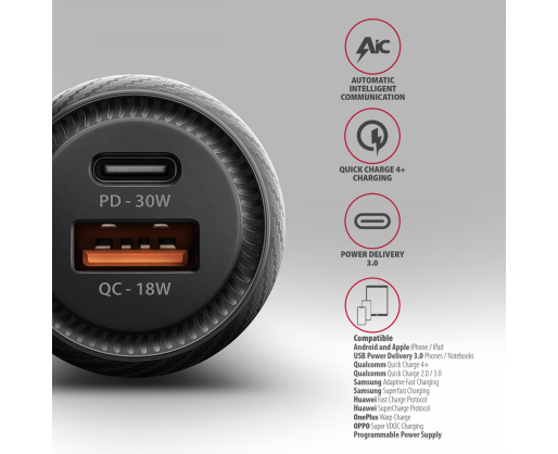 | Gamintojo prekės serija | Car charger 48W, USB-A + USB-C, PD3.0/PPS/QC4+/SFC |