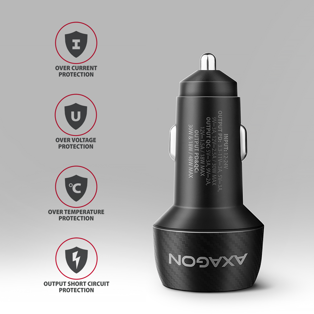 - AXAGON PWC-PQ48 Car charger 48W, USB-A + USB-C, PD3.0/PPS/QC4+/SFC, Black 605350