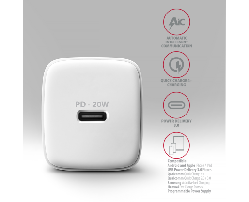- AXAGON Wallcharger 1x port USB-C, PD3.0 / PPS /QC4+/AFC/FCP/Apple, 20W | ACU-PD20W 464961