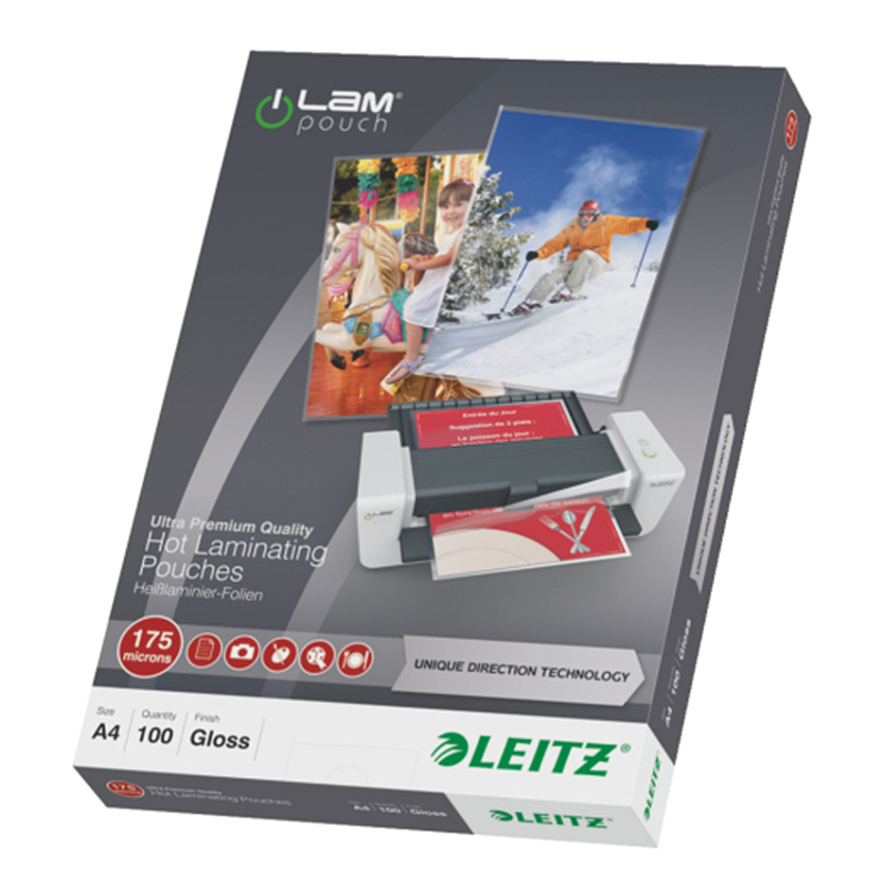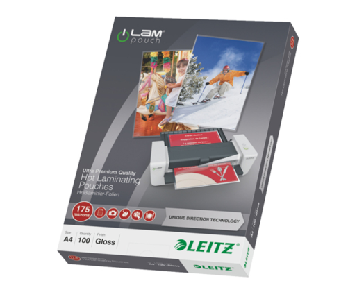 - Laminavimo vokeliai Leitz, A4, 216x303 mm, 175 mik., UDT, blizgūs, 100 vnt.