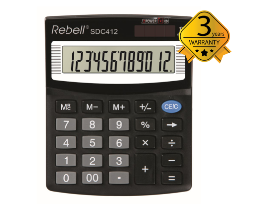 Skaičiuotuvas kišeninis Rebell SDC412 12 skaitmenų/ 1 eilutės ekranas Procentų f-ja Matematinės f-jos Kieti plastikiniai mygtukai 3 atminties mygtukai Dvigubas nulis [00] Koreagavimo mygtukas Maitinimas saulės baterijomis ir elementais Be tekstinės atminties Atitikmuo Citizen SDC812 Spalva: juoda Matmenys : 125x100x27 mm Svoris : 100 g Gamintojas: REBELL http://www.rebell4you.com/en/search/find/sdc412