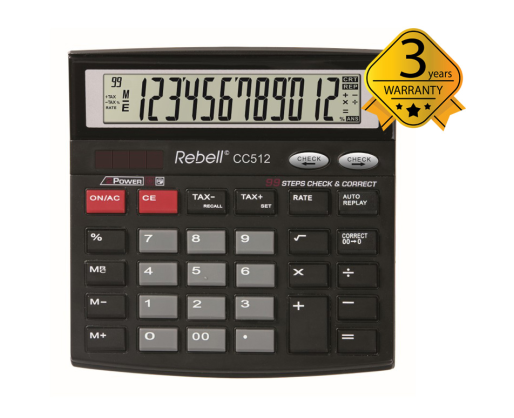 Skaičiuotuvas stalinis Rebell CC512 12 skaitmenų/ 1 eilutės kampu lenktas ekranas Procentų skaičiavimo f-ja Mokesčių skaičiavimas [TAX+; TAX-] Matematinės f-jos Šaknies f-ja Koreagavimo mygtukas Dvigubas nulis [00] 3 atminties mygtukai Kieti plastikiniai mygtukai Maitinimas saulės baterijomis ir elementais Be tekstinės atminties Tikrinimo ir taisymo funkcija Atitikmuo Citizen CT555N Spalva: juoda Matmenys : 131x128x23 mm Svoris : 129 g Gamintojas: REBELL http://www.rebell4you.com/en/search/find/cc512