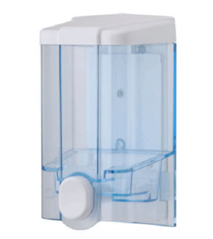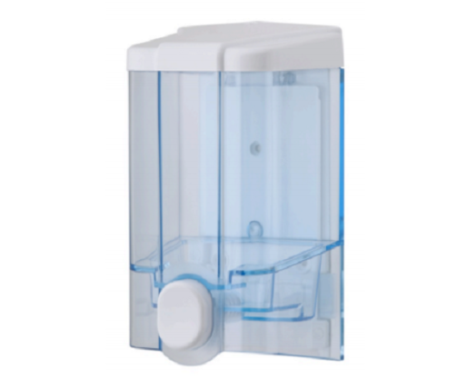 Skaidrus plastikinis muilo dozatorius. Tvirtinamas prie sienos (komplektacijoje yra tvirtinimo detalės).
