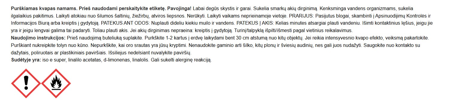 Namams, kuriuose turėtų dominuoti švelnumas ir elegancija. Vos per kelias sekundes pripildysi savo namus išskirtine nuotaika.Puikiai tinka kvėpinti automobilį, spintą, medžiagas, kitus daiktus. Turiu bene aukščiausią grynojo aliejaus koncentraciją tarp panašių produktų. Kvapo buteliuko (200 ml) užtenka 727 papurškimams!