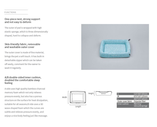 Kitos savybės The outer cover is made of fine material, brings the pet a soft touch. It has built-in detachable zipper which can be taken off easily, convinent for the owner to wash it regularly.