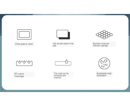 Specialios funkcijos A/B double-sided inner cushion, doubled the comfortable sleep feeling. A side uses high quality bamboo charcoal memory foam which not only relieves pressure evenly, but also has a porous structure on the surface for heat dissipation, suitable for all seasons.B side uses a 3D wave-shaped foam which the curves are subtle and relieves pressure evenly, and enjoys a nice body feeling just like massage.