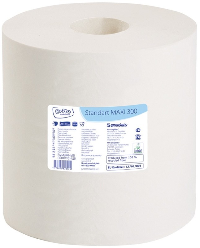 Popieriniai rankšluosčiai ritinyje GRITE Standart MAXI 300 Coreless. Pagaminti iš celiuliozės, be įspaudimų. 1 sluoksnio, baltos spalvos, lapelio išmatavimai 31,5x20 cm, 952 lapeliai rulone. Rulono ilgis 300 m. Tinka sąlyčiui su maistu. Prekė užsakoma pilnomis pakuotėmis, po 6 rulonus