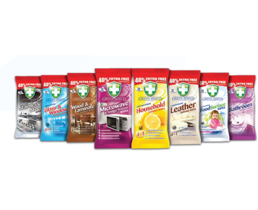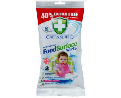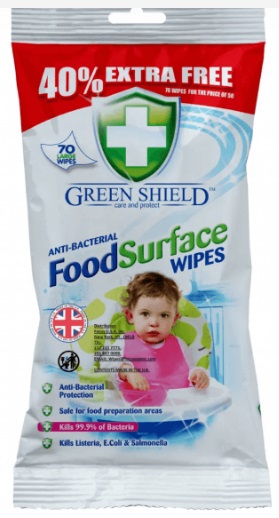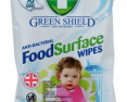 Green Shield apsaugo buitinius valgymo paviršius nuo bakterijų ir mikrobų. Servetėlės yra veiksmingos prieš daugelį kenksmingų bakterijų: E. coli, listerijas ir salmoneles. Jos tinka naudoti maisto ruošimo vietoms, kaitletėms, maitinimo kėdutėms, virtuviniams stalviršiams. Servetėlės skirtos antibakterinei paviršių apsaugai, pašalina iki 99,9%.