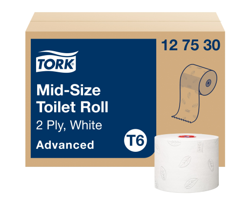 Tualetinis popierius ADVANCED COMPACT AUTO SHIFT T6, 127530. Pagamintas iš perdirbto pluošto, dviejų sluoksnių. Matmenys: 9,9 cm x 100 m. Baltos spalvos. Dėžėje 27 pakeliai. Tinka laikikliams: 557500, 557508.