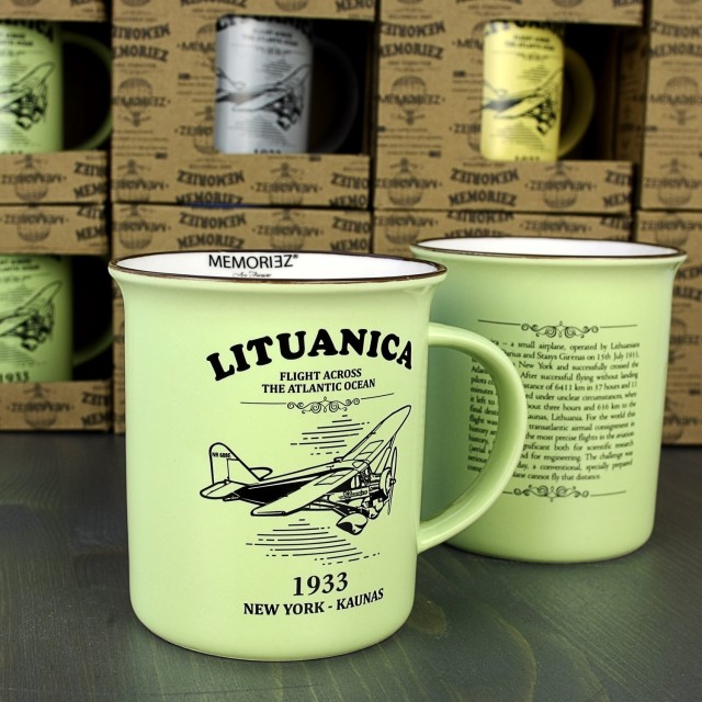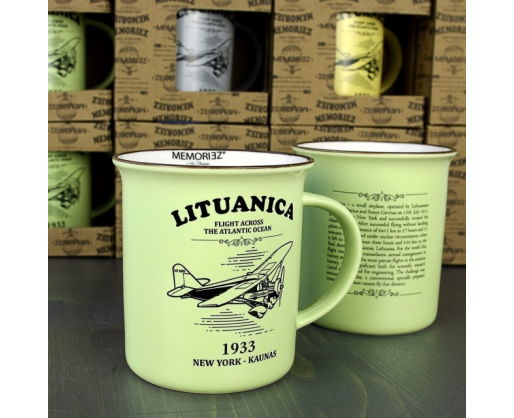 Puodelio antroje pusėje rasite trumpai aprašytą Lituanicos skrydžio istoriją anglų kalba.