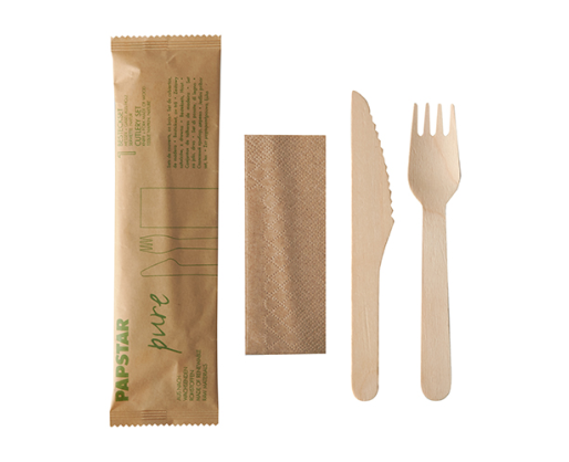 Įrankių rinkinys PAPSTAR, šakutė, peilis, servėtėlė, mediniai, higieninėje pakuotėje 50 vnt.
