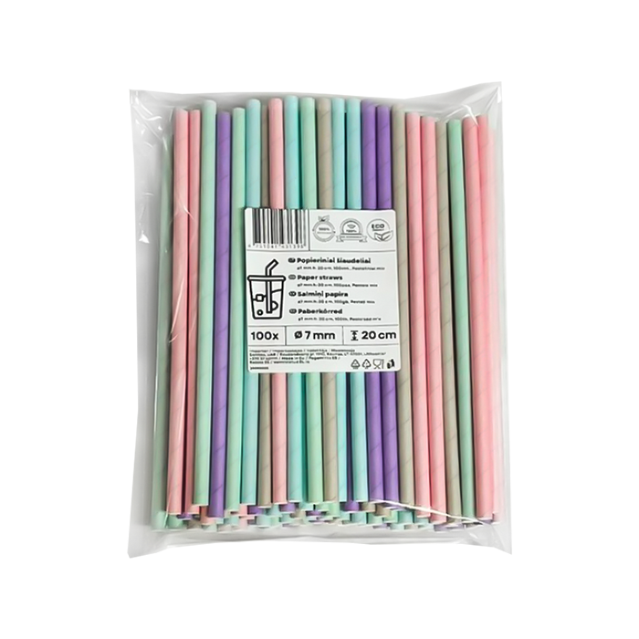 Popieriniai šiaudeliai, pasteliniai, D 7 mm, L 20 cm, 100 vnt