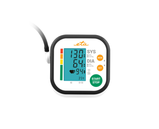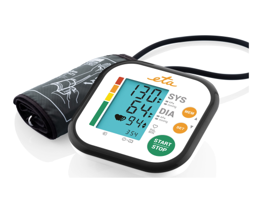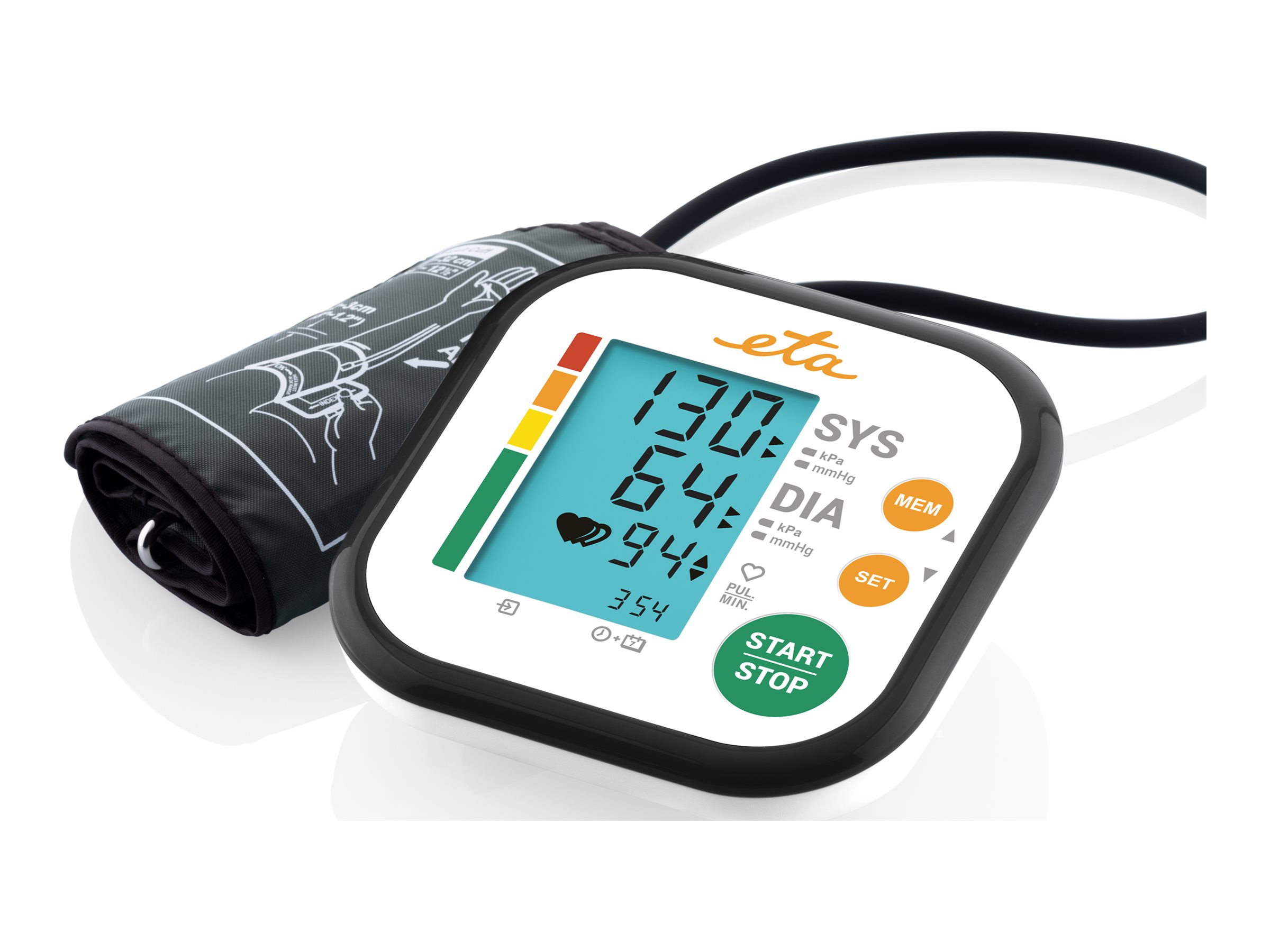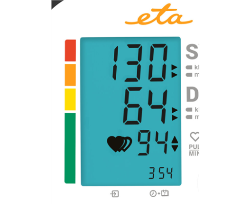 ETA | Upper Arm Blood Pressure Monitor | ETA229790000 | Memory function | Number of users 2 user(s) | 4 | Suitable for home use. Measurement of systolic and diastolic pressure, pulse. Oscillometric measurement method. Display of measured values on LCD. Fully automatic filling and deflation of the cuff. Pressure measurement accuracy +/- 3 mmHg, pulse +/- 5%. Pressure measurement range 0 - 299 mmHg, pulse 40 - 199 per minute. Irregular heart rate detection. WHO blood pressure classification. | Upper Arm 325425