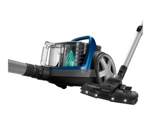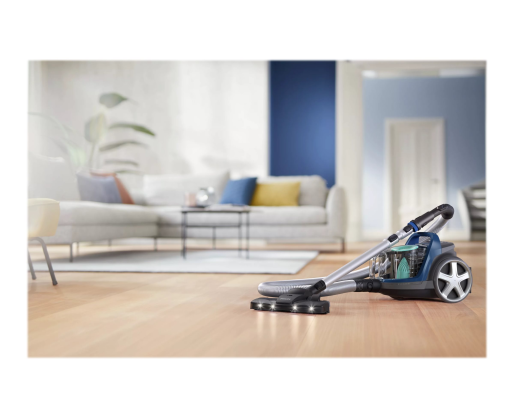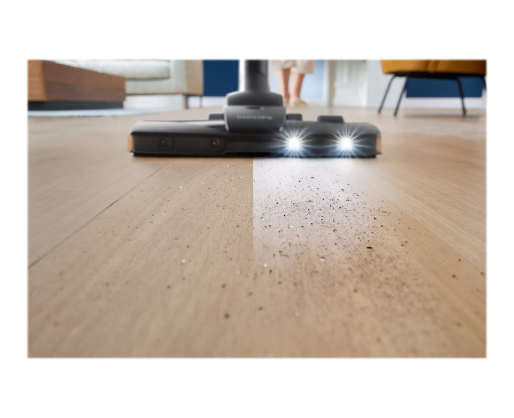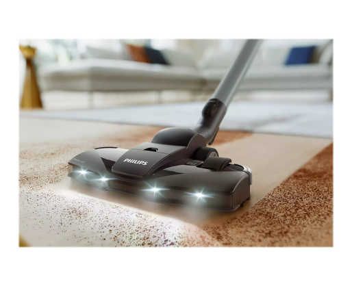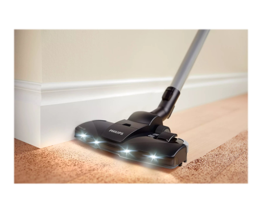 Kitos savybės PowerCyclone 7 maintains strong suction power for longer; Power control function to adjust the suction power; Soft bumper and rubber wheels to protect the furniture; The TriActive with LED tip illuminates barely visible dust so you can thoroughly clean it