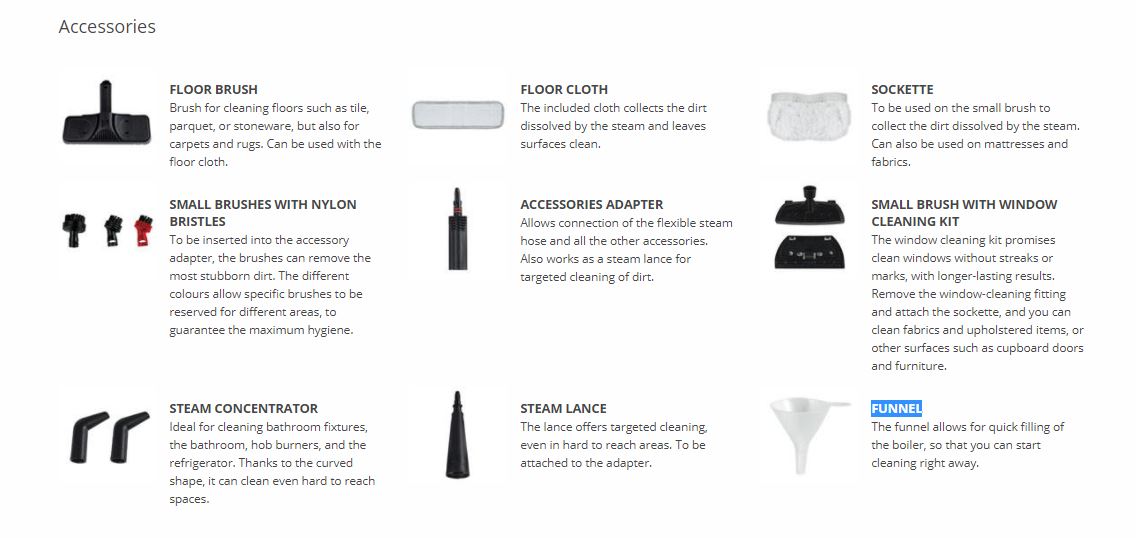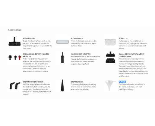 | Priedai pridėti | 12 included accessories: floor brush, floor cloth, sockette, small brushes with nylon bristles, accessories adapter, small brush with window cleaning kit, steam concentrator, steam lance, funnel |
