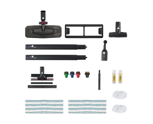 | Priedai pridėti | 14 Accessories included: hard floor brush, carpet accessory, small brass bristle brush, window cleaning brush, small brush, steam concentrator + brush, 3 small coloured brushes with nylon bristles, steam lance, 2 floor cloths, 2 sockettes, 2 vials of Kalstop. |