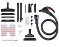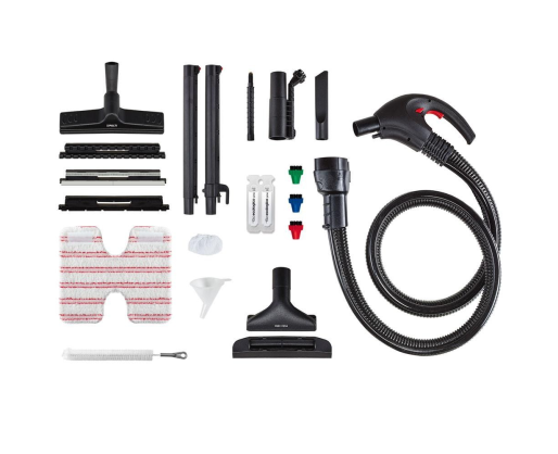 | Priedai pridėti | 13 included accessories: universal brush with frames, steam + vacuum nozzle, window cleaning accessory 200 mm, steam concentrator + small nylon brush, steam lance, suction lance, 3 small coloured nylon brushes, cloth for all floors, sockette, jug, tank cleaning brush, bioecologico. |