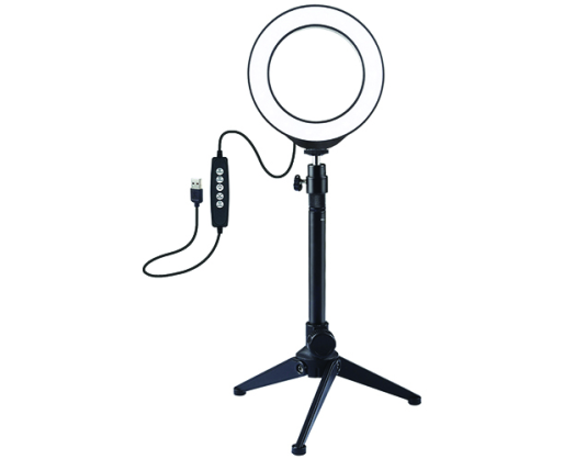 - LED žiedinė lempa 12cm, su trikoju staliniu stovu iki 24.5cm, USB, RGBW
