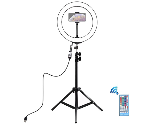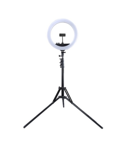 LED žiedinė lempa 26cm skersmens su trikoju stovu reguliuojamu iki 1.1m aukščio, su telefono laikikliu, RGBW, BT, USB.Ypatybės: