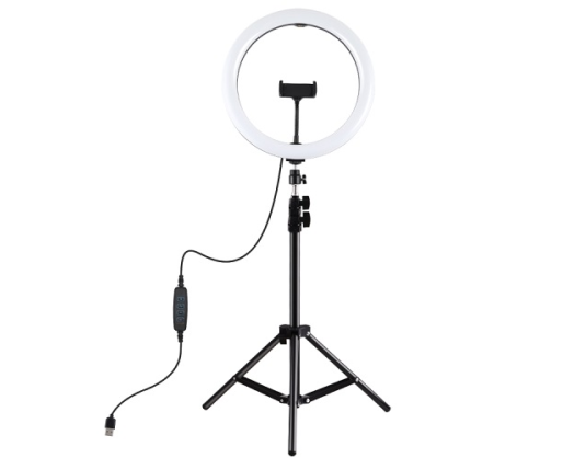 LED žiedinė lempa 30cm skersmens su trikoju stovu reguliuojamu iki 1.1m aukščio, su telefono laikikliu.Ypatybės: