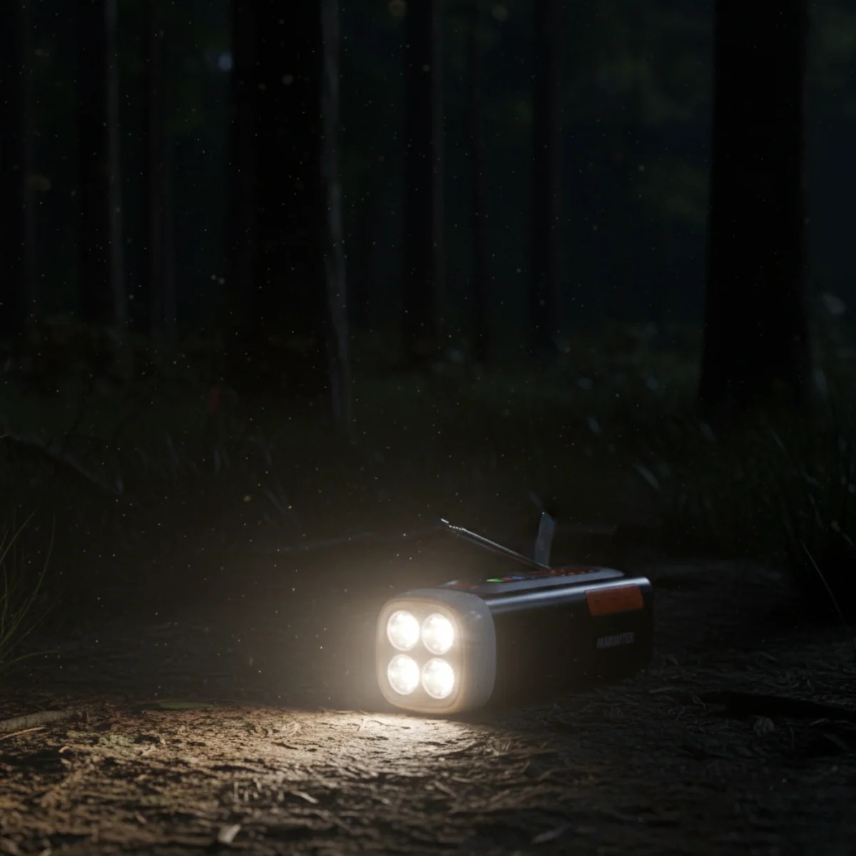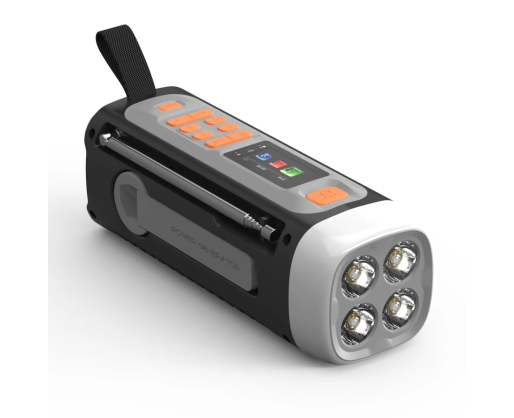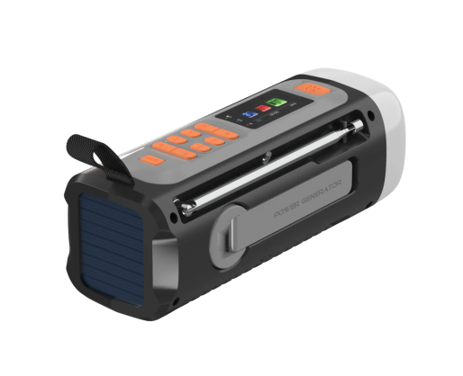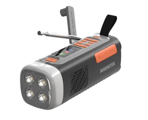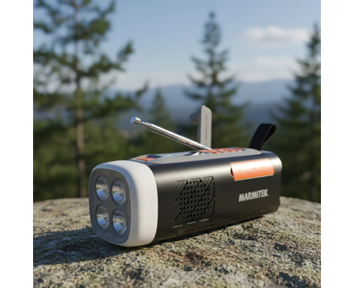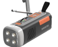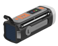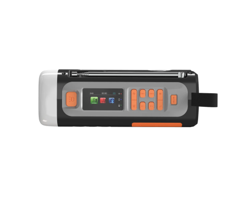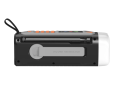 | Kitos savybės | Wind-up radio with DAB+/FM; Bluetooth 5.3 for wireless music streaming; Powerbank function with 4500 mAh battery; Charging via USB-C, solar panel or hand crank; 360° camping light and flashlight (dimmable); SOS alarm with light and siren; Robust and splash resistant (IPX3) |