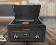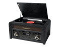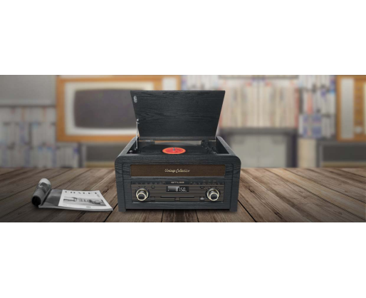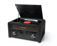 | Specialios funkcijos | Stream music from another Bluetooth compatible device such as Laptop, Tablet or Smartphone. FM radio with 30 preset stations. Drawer-type CD door CD, CD-R/RW, MP3 compatible. Wooden cabinet. 3 speeds stereo turntable 33/45/78 RPM. USB port for playback and encoding. Auto-stop ON/OFF switch. 45RPM record adaptor |
