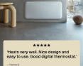 | Kitos savybės | High efficiency and low surface temperature, 100% silent operations, Accurate electronical thermostat. Thermostat: Day/night programs. |