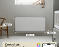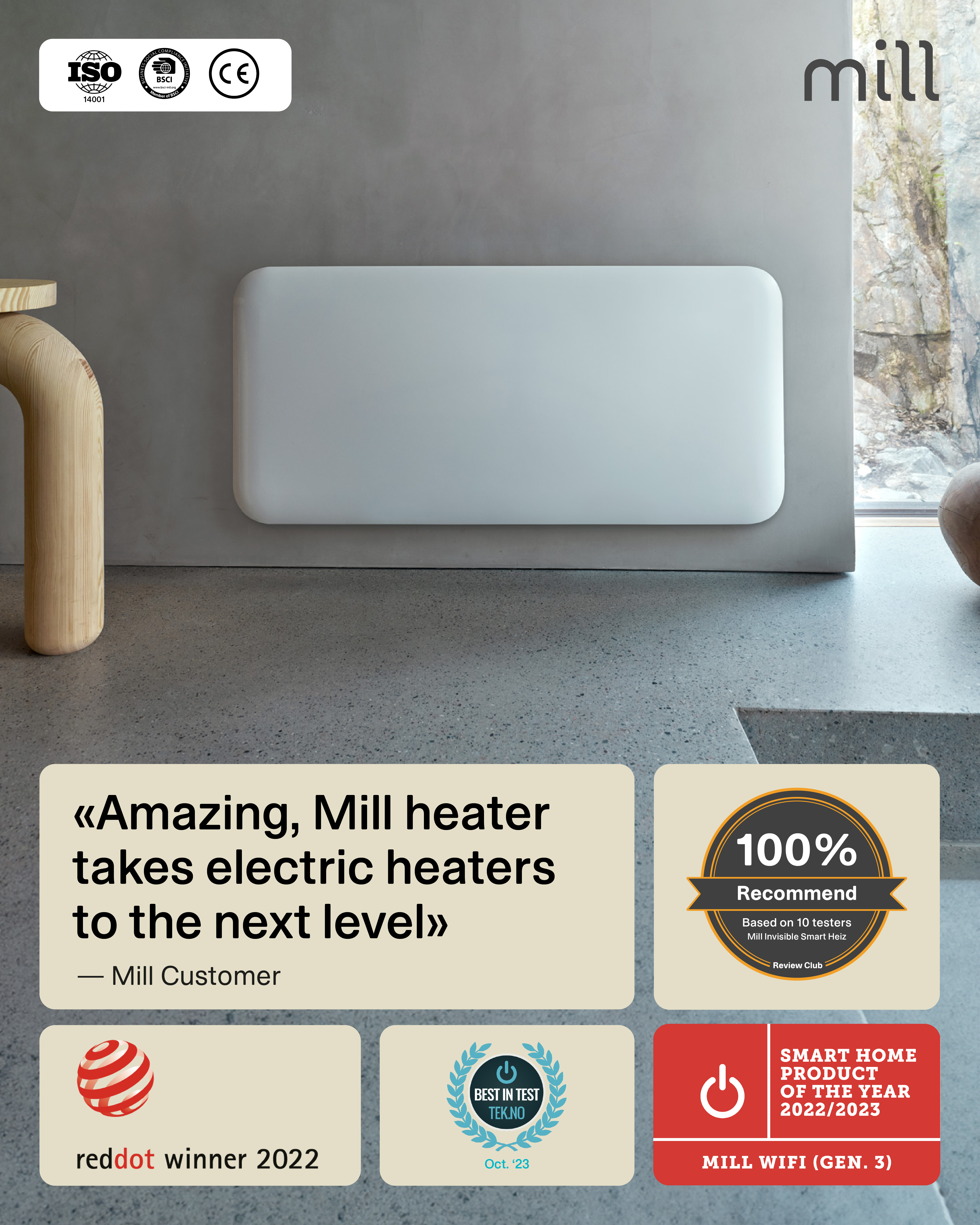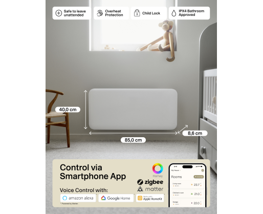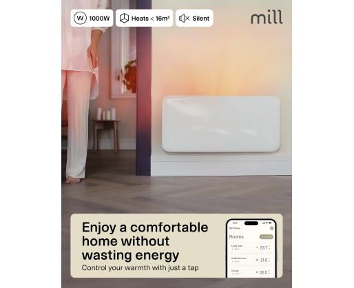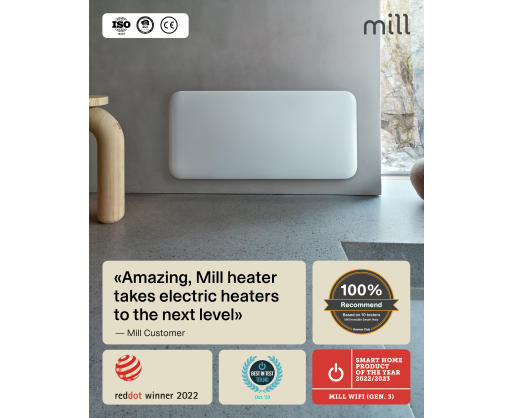 | Specialios funkcijos | Connectivity: WiFi 2.4 Ghz (WiFi 6). Zigbee 3.0; LED Display for easy reading; Fast and even distribution of heat in the whole room; Low energy control; Mill PID Wattage Tech; Mill Predictive Heating; Open Window Function; Silent operation; Child safety lock |
