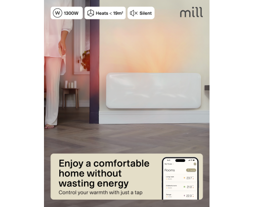 | Specialios funkcijos | Easy connection to WiFi via Bluetooth 5.2; LED Display for easy reading; Fast and even distribution of heat in the whole room; Low energy control; Mill PID Wattage Tech; Mill Predictive Heating; Open Window Function; Silent operation |
