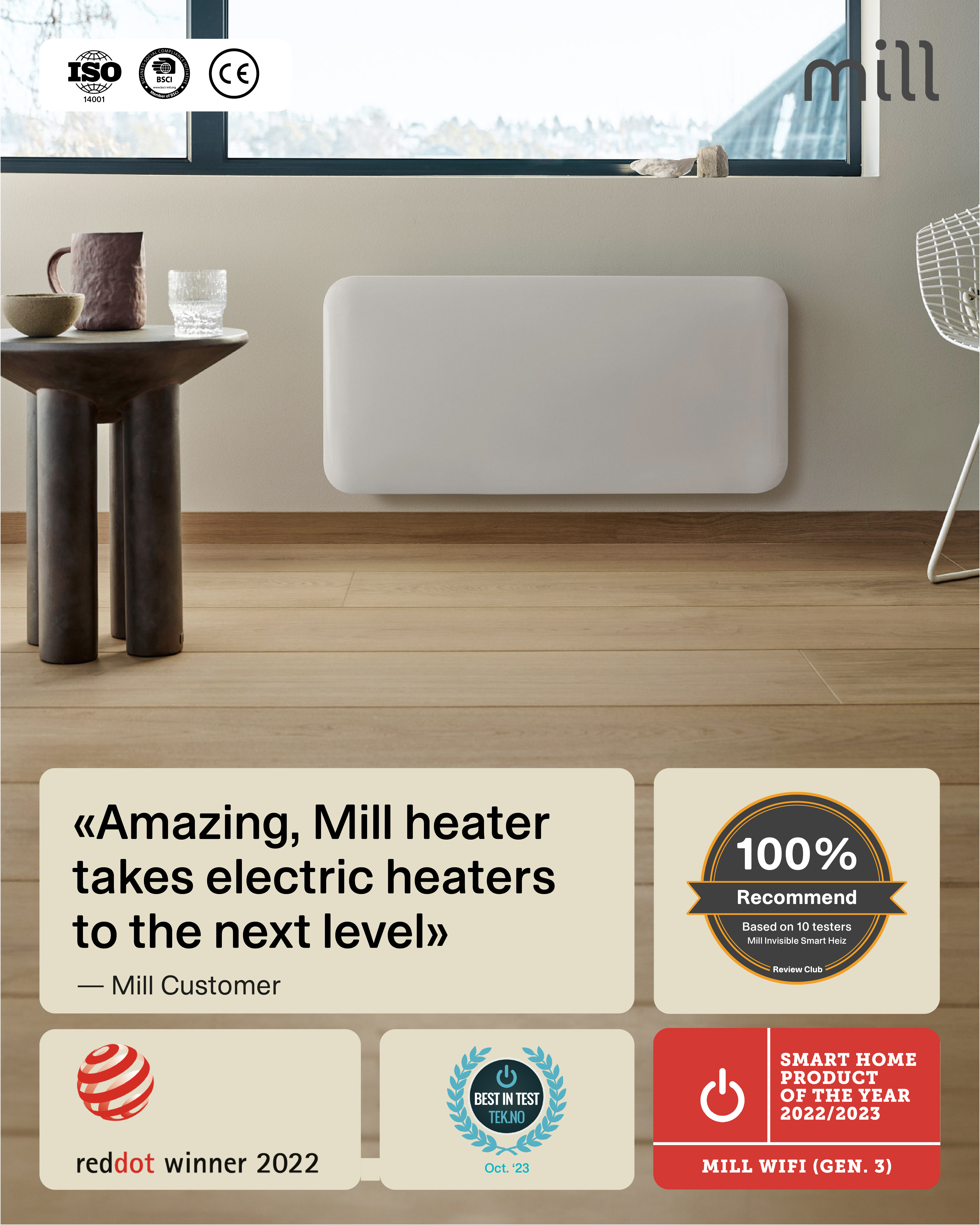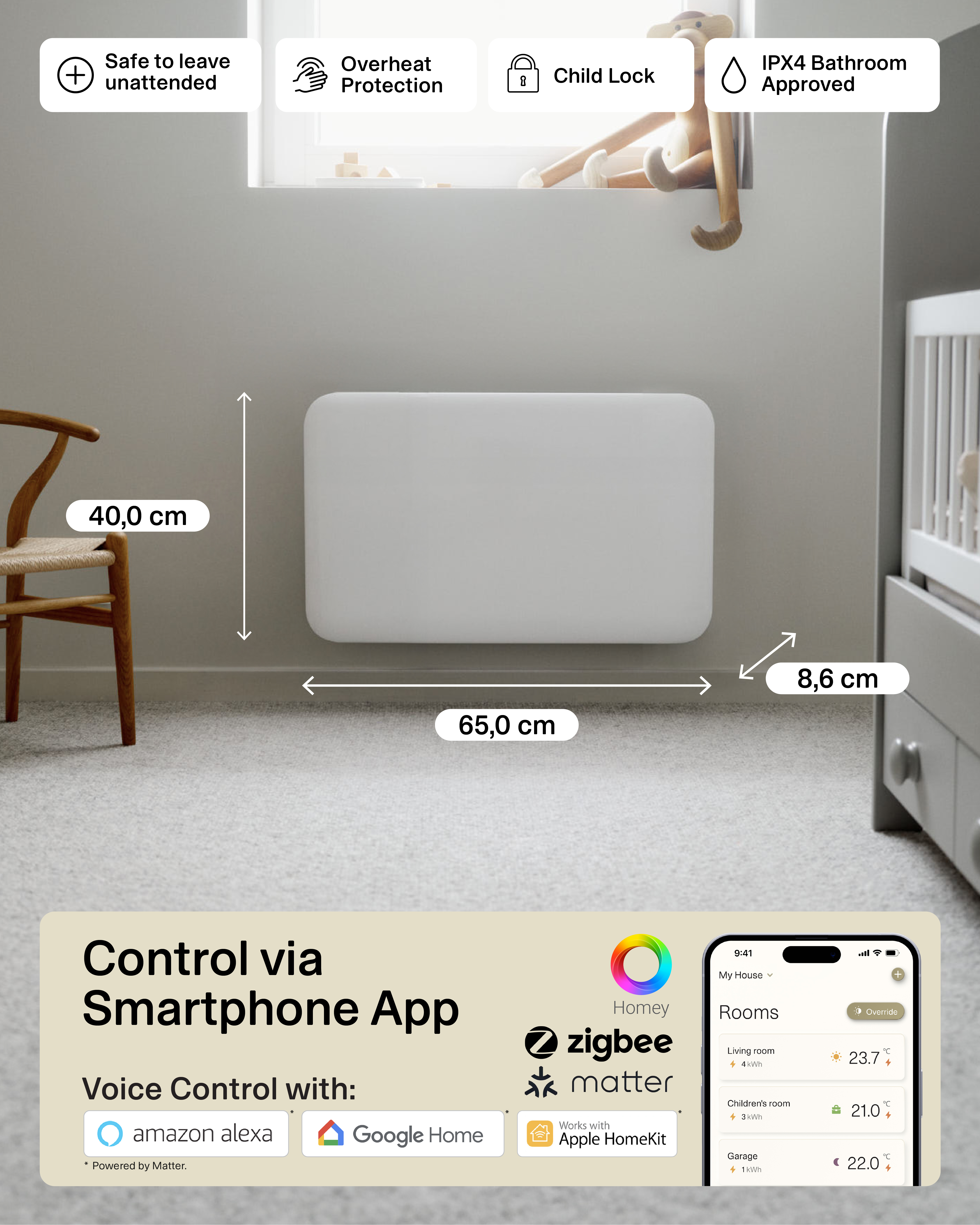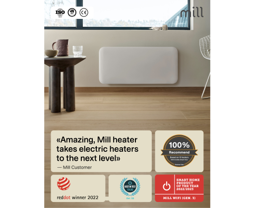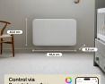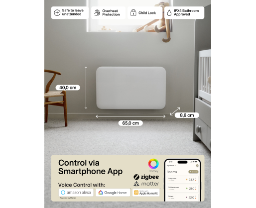 | Specialios funkcijos | Connectivity: WiFi 2.4 Ghz (WiFi 6). Zigbee 3.0; LED Display for easy reading; Low energy control; Mill PID Wattage Tech; Mill Predictive Heating; Child safety lock; Silent operation; Open Window Function |