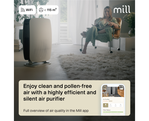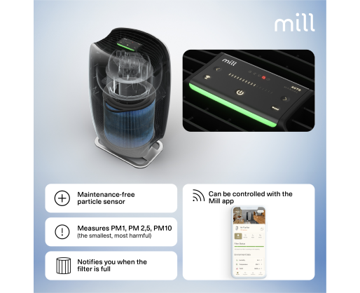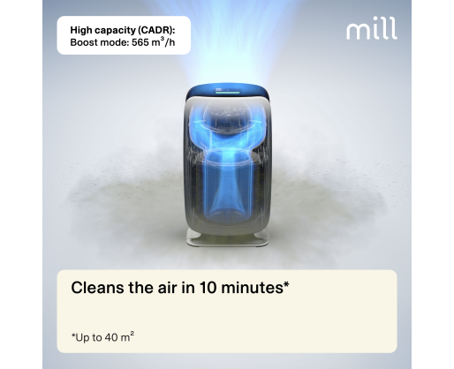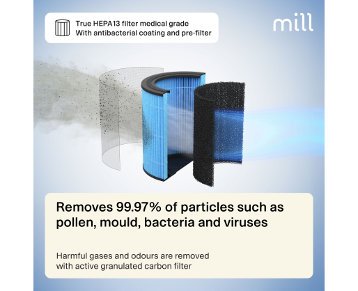 | Specialios funkcijos | Mill Silent Pro Air Purifier cleans the indoor air in less than 10 minutes (room size <40m2), and effectively removes 99.97% of all harmful particles and gases. |