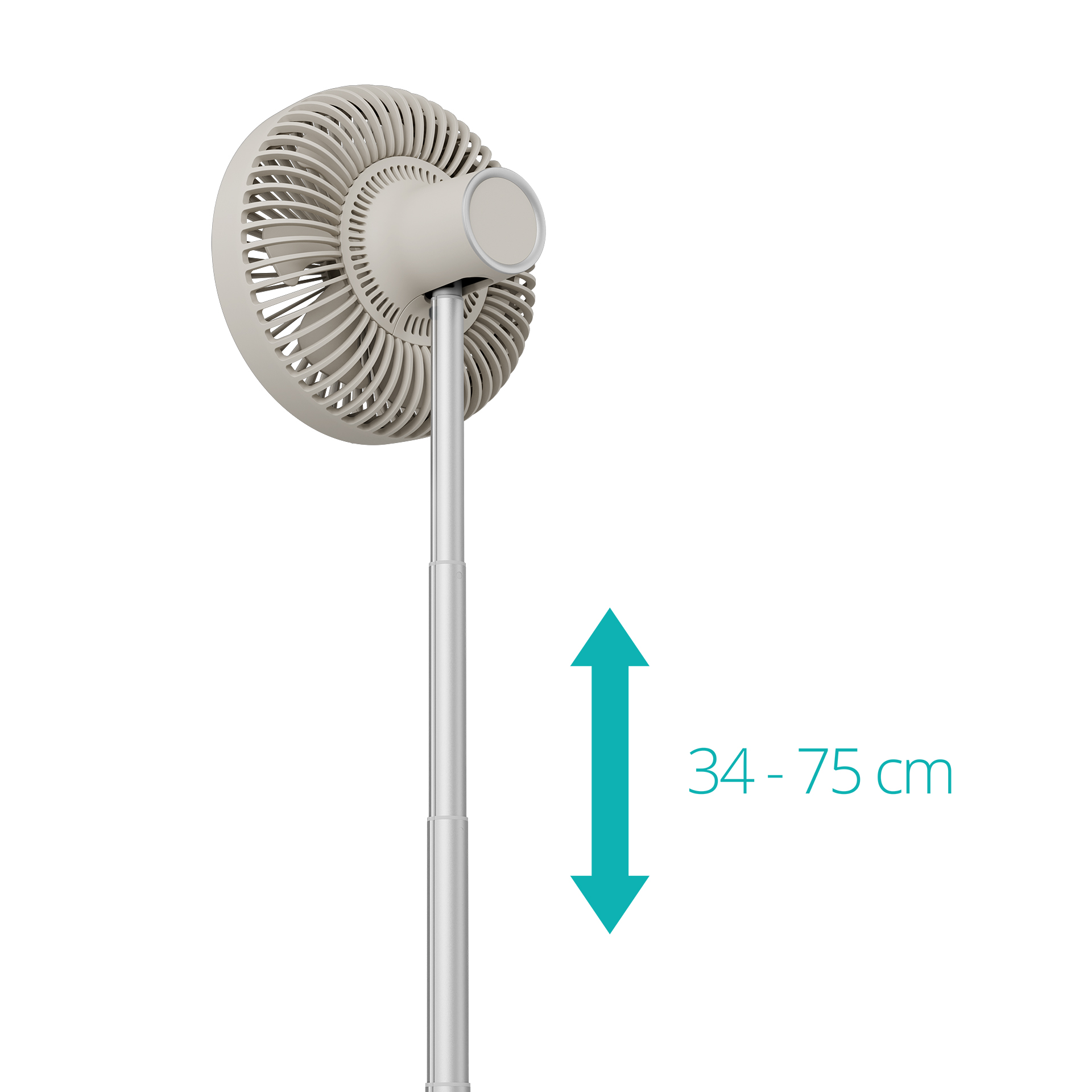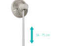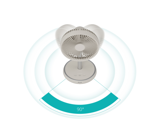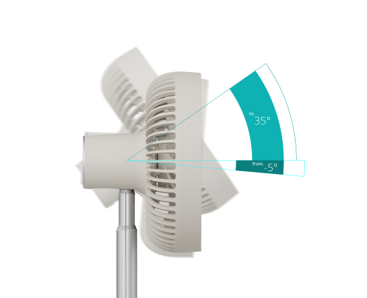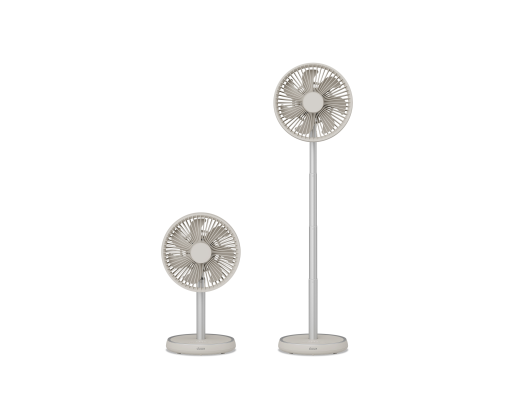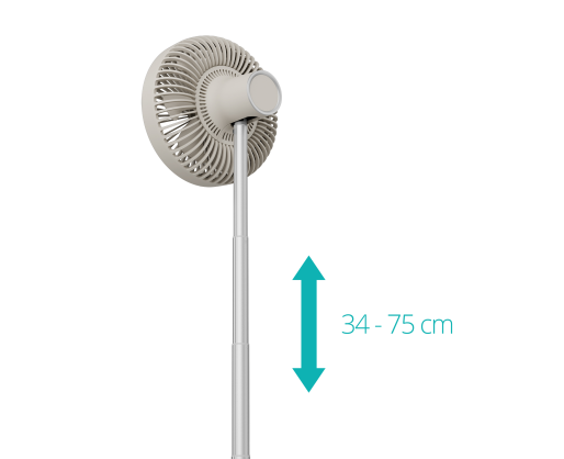 | Kitos savybės | Wireless with long battery life - Up to 15 hours of cool, rechargeable via USB-C; Adjustable height - From a 34 cm table fan to a 75 cm floor model; Wide cooling range - 90° horizontal oscillation and 35° vertical tilt |