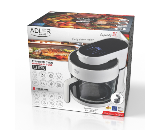 Adler Air Fryer Oven with Glass Bowl | AD 6316 | Power 1200 W | Capacity 3 L | Convection | White/Black 459200