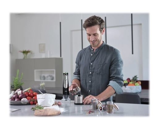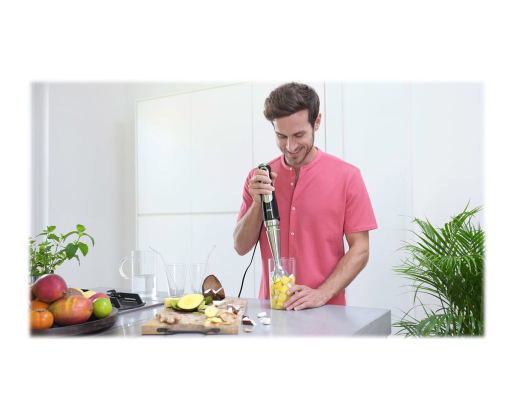 | Kitos savybės | ActiveBlade Technology: flexible shaft for finer blending results; Speed regulation: Intuitive, seamless Advanced SmartSpeed button; PowerBell Plus Technology: SplashControl + extra milling blade for efficent blending results; EasyClick system: quick & easy change of accessories |