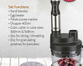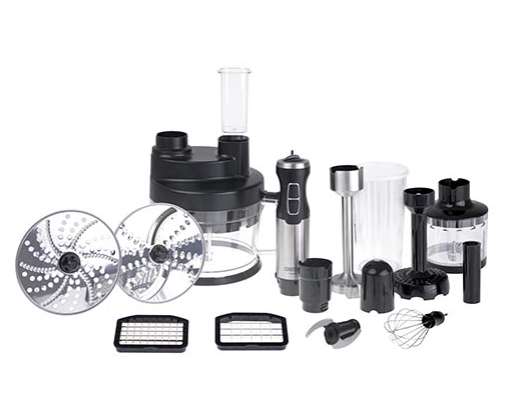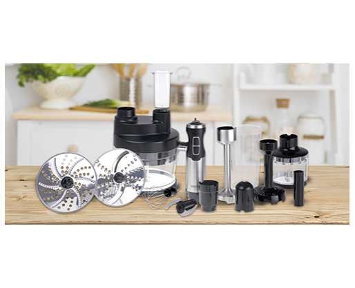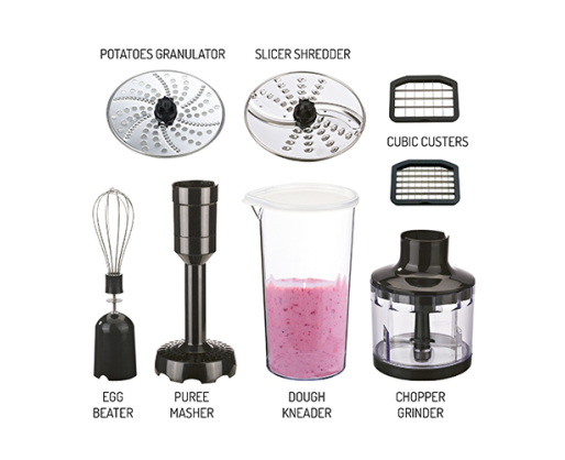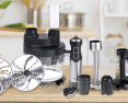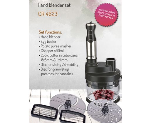 | Priedai pridėti | Hand blender; Egg beater; Potato puree masher; Chopper 400 ml; Cubic cutter in cube sizes: 8x8 mm&11x11 mm; Disc for slicing/shredding; Disc for granulating potatoes for pancakes. |