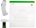 | Kitos savybės | The vacuum pump automatically shuts off once all the air has been removed from bags or bottles, ensuring an airtight seal; The device can be powered via a mains adapter or batteries, making it ideal for home use, camping, or travel; Suitable for most standard glass bottles, perfect for sealing wine, juices, or other beverages; Reusable vacuum bags: 2x (22cm x 21cm), 2x (22cm x 31cm), 2x (26cm x 28cm), 2x (26cm x 34cm), 2x (30cm x 34cm) |